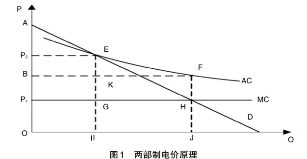 對(duì)于固定成本占比較大的商品定價(jià),政府管制最優(yōu)定價(jià)是采用兩部制定價(jià),固定成本通過與交易量無關(guān)的基本費(fèi)用回收,交易價(jià)格按單位變動(dòng)成本確定,全部變動(dòng)成本按交易量回收。如圖1所示,AC為平均成本曲線,MC為邊際成本曲線,D為用電需求曲線。由于需求曲線D與平均成本曲線AC的交點(diǎn)為E,按平均成本定價(jià)的價(jià)格為P2,平均成本定價(jià)下用電量是I,總成本為面積OP2EI,其中,P1P2EG為固定成本,OP1GI為變動(dòng)成本。需求曲線D與邊際成本曲線MC的交點(diǎn)是H,按照邊際成本定價(jià)的價(jià)格為P1,用電量是J,變動(dòng)成本為面積P1HJO。無論按邊際成本定價(jià)還是按平均成本定價(jià),固定成本不變,即矩形P1P2EG面積與矩形P1BFH面積相等。