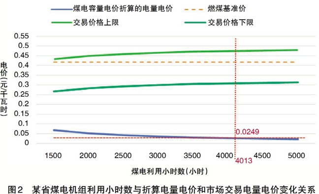 其中P基表示燃煤基準(zhǔn)價(jià)。根據(jù)上面的計(jì)算公式,某省煤電利用小時(shí)變化與容量電價(jià)折算電量電價(jià)和市場(chǎng)交易電量電價(jià)的關(guān)系如圖2所示。2023年,該省煤電利用小時(shí)為4013小時(shí),垂直紅色虛線表示2024年該省煤電容量電價(jià)折算的電量電價(jià)。從圖中可以看出,隨著煤電利用小時(shí)降低,煤電容量電價(jià)折算電量電價(jià)提高;相反,如果煤電利用小時(shí)增加,則煤電容量電價(jià)折算電量電價(jià)降低。