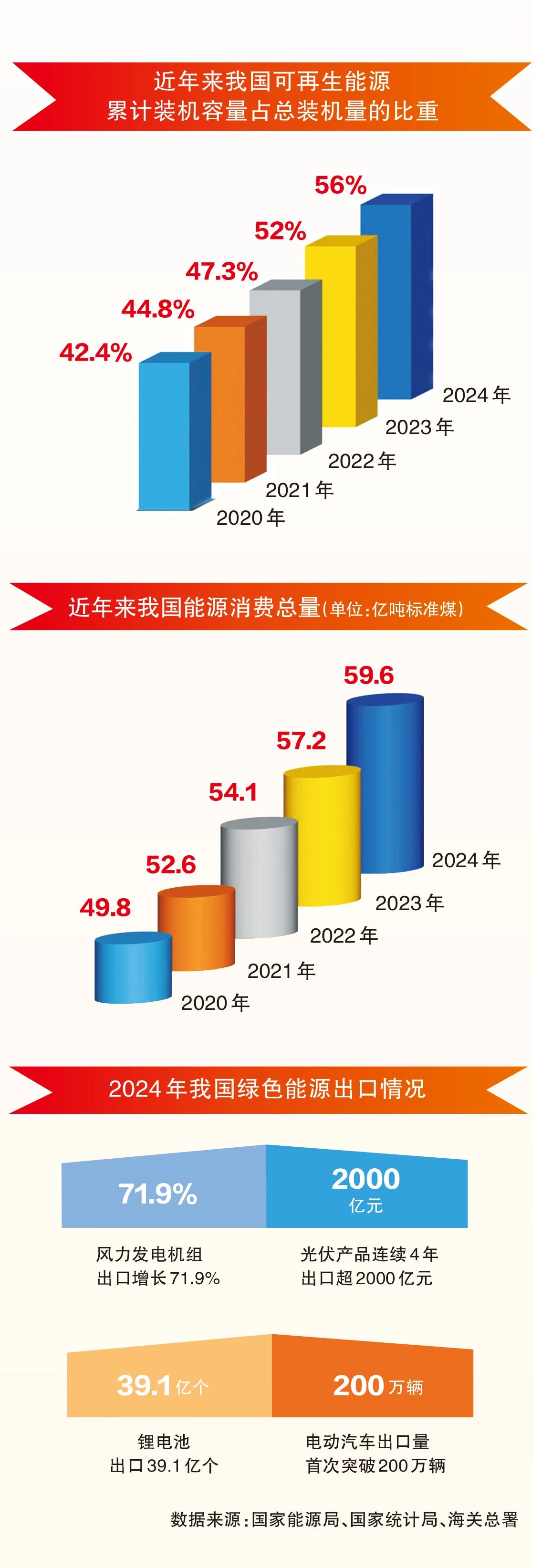 2024年,我國風(fēng)力發(fā)電機(jī)組出口增長71.9%;光伏產(chǎn)品連續(xù)4年出口超2000億元;鋰電池出口39.1億個;電動汽車出口量首次突破200萬輛,創(chuàng)歷史新高。我國的綠色貿(mào)易領(lǐng)跑全球。能源成為我國外貿(mào)的重要領(lǐng)域之一,拉動總量、增量、質(zhì)量“三量”齊升。