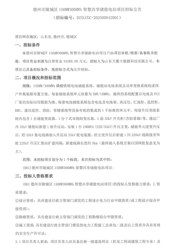 中國儲能網(wǎng)訊:3月1日,山東天衢大數(shù)據(jù)科技有限公司發(fā)布山東省德州市陵城區(qū)150MW/300MWh智慧共享儲能電站項目招標公告。