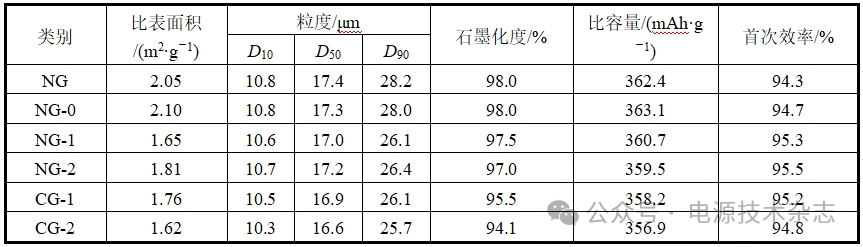 取致密化天然石墨NG-2與普通石油焦二次顆粒人造石墨(骨料D50為10 μm,二次顆粒D50為14 μm)復(fù)合,得到復(fù)合石墨CG-1 [70%(質(zhì)量分數(shù))NG-2+30%(質(zhì)量分數(shù))人造石墨]與CG-2 [50%(質(zhì)量分數(shù))NG-2+50%(質(zhì)量分數(shù))人造石墨]。
