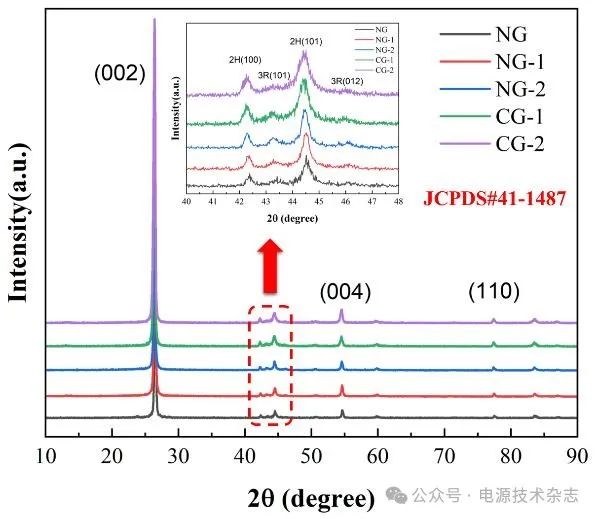 圖3為不同種類石墨材料的X射線衍射(XRD)圖,從中可以看到,幾種材料的(002)晶面衍射峰位置基本一致,表明材料層狀結(jié)構(gòu)基本一致[13]。將2θ角度在40°~48°的XRD衍射圖放大,可以發(fā)現(xiàn)NG、NG-1和NG-2三款天然石墨材料不僅具有六方結(jié)構(gòu)的2H相,還明顯可以看到有菱形結(jié)構(gòu)的3R相存在,表明天然石墨同時具有2H相和3R相,而人造石墨一般只有2H相,沒有3R相存在。因此,從圖3的放大圖中可以看到,復(fù)合部分人造石墨的復(fù)合石墨CG-1與CG-2的3R相對應(yīng)的峰強度隨人造石墨占比提高而降低。添加30%人造石墨的CG-1的XRD圖譜中還可以看到3R相的存在,但相比純天然石墨NG-2,3R相的峰強度有所降低;添加50%人造石墨的CG-2的XRD圖譜中則幾乎無法看到3R相的存在,表明當材料中3R相的比例較低時,在XRD譜圖中很難發(fā)現(xiàn)其存在。