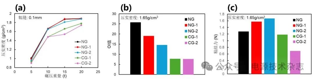 圖4(c)為不同石墨極片的粘結(jié)力柱狀圖,可以看到純天然石墨的粘結(jié)力較高,且相比普通天然石墨,經(jīng)致密化處理的天然石墨粘結(jié)力進一步提高,因致密化天然石墨表面光滑程度下降,粗糙的表面使得顆粒與粘結(jié)劑的接觸面積增加,導(dǎo)致粘結(jié)力提高;復(fù)合人造石墨后,材料的粘結(jié)力有所降低。