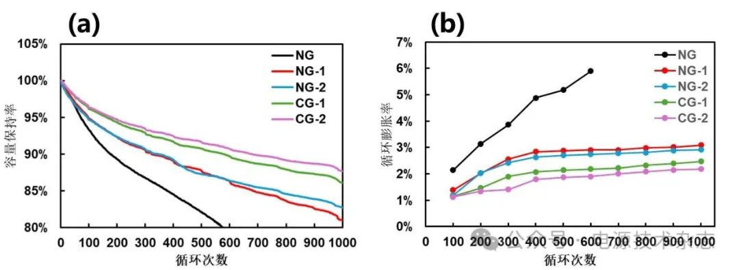 圖6展示了不同石墨材料在25 ℃下以0.5 C充電/1 C放電制式循環(huán)1 000次的容量保持率曲線和電池膨脹率曲線,可以看到,未經(jīng)致密化處理的普通天然石墨材料循環(huán)膨脹率較高,對應(yīng)的循環(huán)壽命也較差,循環(huán)600次后,容量保持率就衰減到80%以下(79.1%);而致密化天然石墨循環(huán)膨脹率大幅降低,循環(huán)1 000次后,容量保持率仍在80%以上,其中NG-1為81%,NG-2為82.7%,且隨致密化程度提高,材料循環(huán)膨脹率降低,容量保持率提高。表明致密化處理可降低循環(huán)過程中材料的膨脹率,緩解因膨脹帶來的顆粒開裂及電解液滲入導(dǎo)致的SEI重復(fù)增長現(xiàn)象,因此Li+消耗減少,材料循環(huán)壽命提高。與致密化天然石墨相比,復(fù)合石墨循環(huán)膨脹率更低,容量保持率更高,循環(huán)1 000次后,NG-1的容量保持率為86.1%,NG-2為87.7%。這主要是因為人造石墨顆粒內(nèi)部完全致密,且經(jīng)過二次造粒后,各向同性更好,因此循環(huán)膨脹率較低,容量保持率較高。
