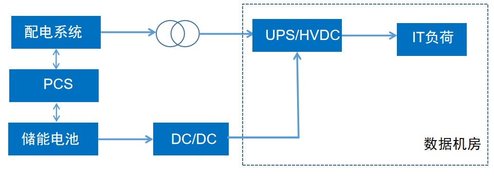 國(guó)內(nèi)部分項(xiàng)目探索儲(chǔ)能電池替代UPS電池,通過將儲(chǔ)能電池經(jīng)DC/DC直流變換器接入U(xiǎn)PS,儲(chǔ)能電池在充放電時(shí)需預(yù)留部分電量,滿足UPS所帶負(fù)荷的備電時(shí)長(zhǎng)要求,從而實(shí)現(xiàn)儲(chǔ)能與UPS的融合應(yīng)用。
