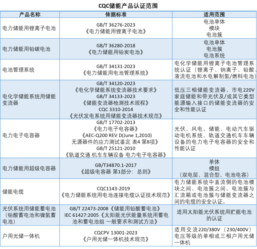 電力儲能產(chǎn)品認證范圍包括:電力儲能用鋰離子電池、鉛炭電池、蓄電池、超級電容器、電池管理系統(tǒng)(BMS)、儲能變流器(PCS)、光儲一體機。CQC通過產(chǎn)品的型式檢驗、工廠檢查、獲證后監(jiān)督等流程,對儲能核心部件產(chǎn)品進行全面的質(zhì)量監(jiān)督。