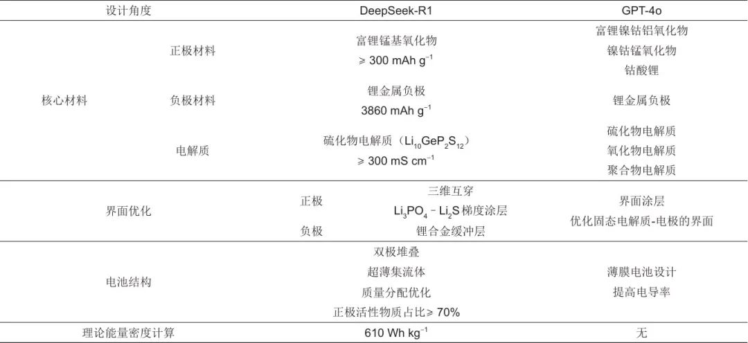 表2 DeepSeek與GPT-4o提出600 Wh kg-1全固態(tài)金屬鋰電池設(shè)計(jì)方案對比