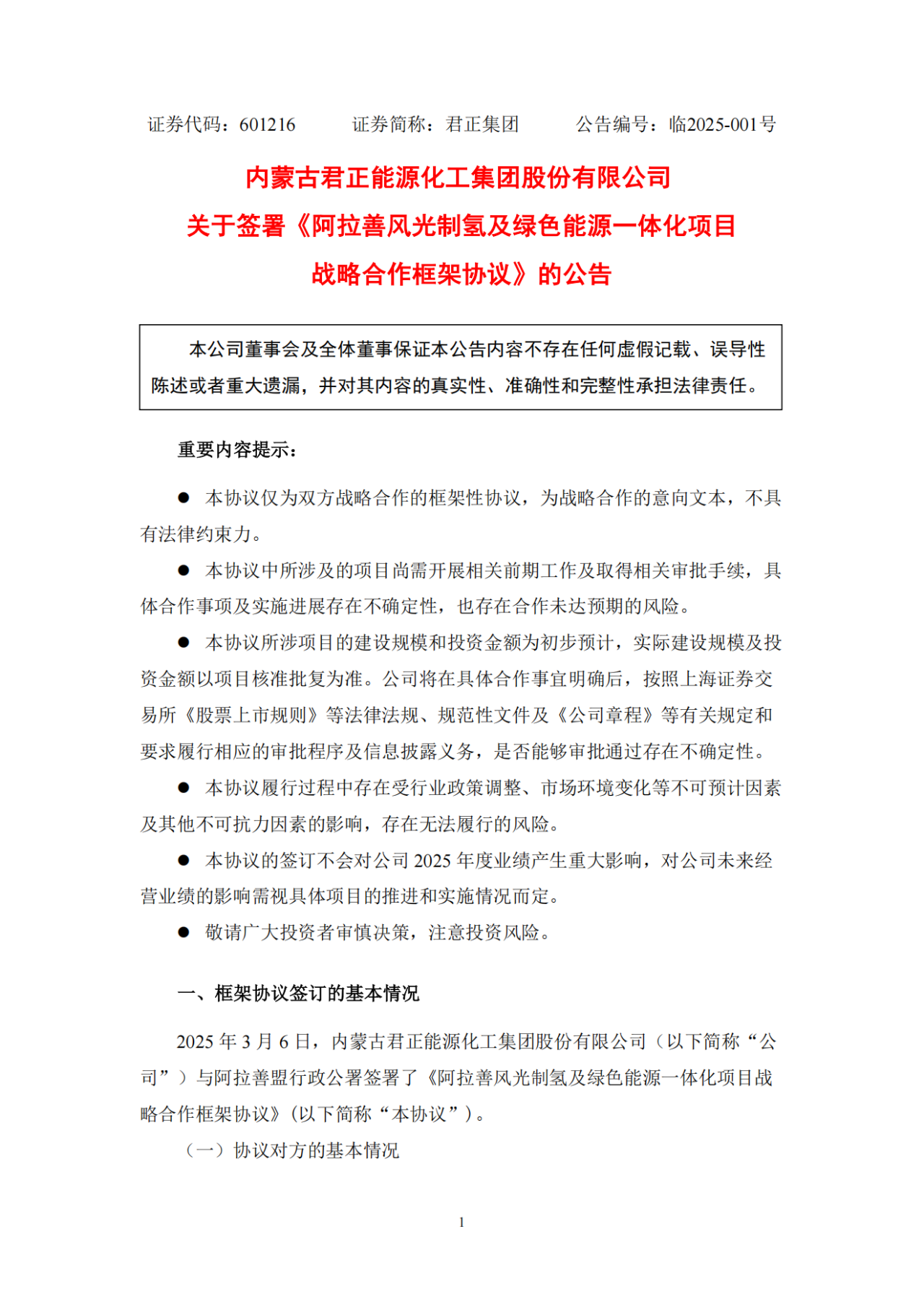 中國儲能網(wǎng)訊:3月6日,內(nèi)蒙古君正能源化工集團(tuán)股份有限公司(簡稱:君正集團(tuán))發(fā)布關(guān)于簽署《阿拉善風(fēng)光制氫及綠色能源一體化項(xiàng)目戰(zhàn)略合作框架協(xié)議》的公告。