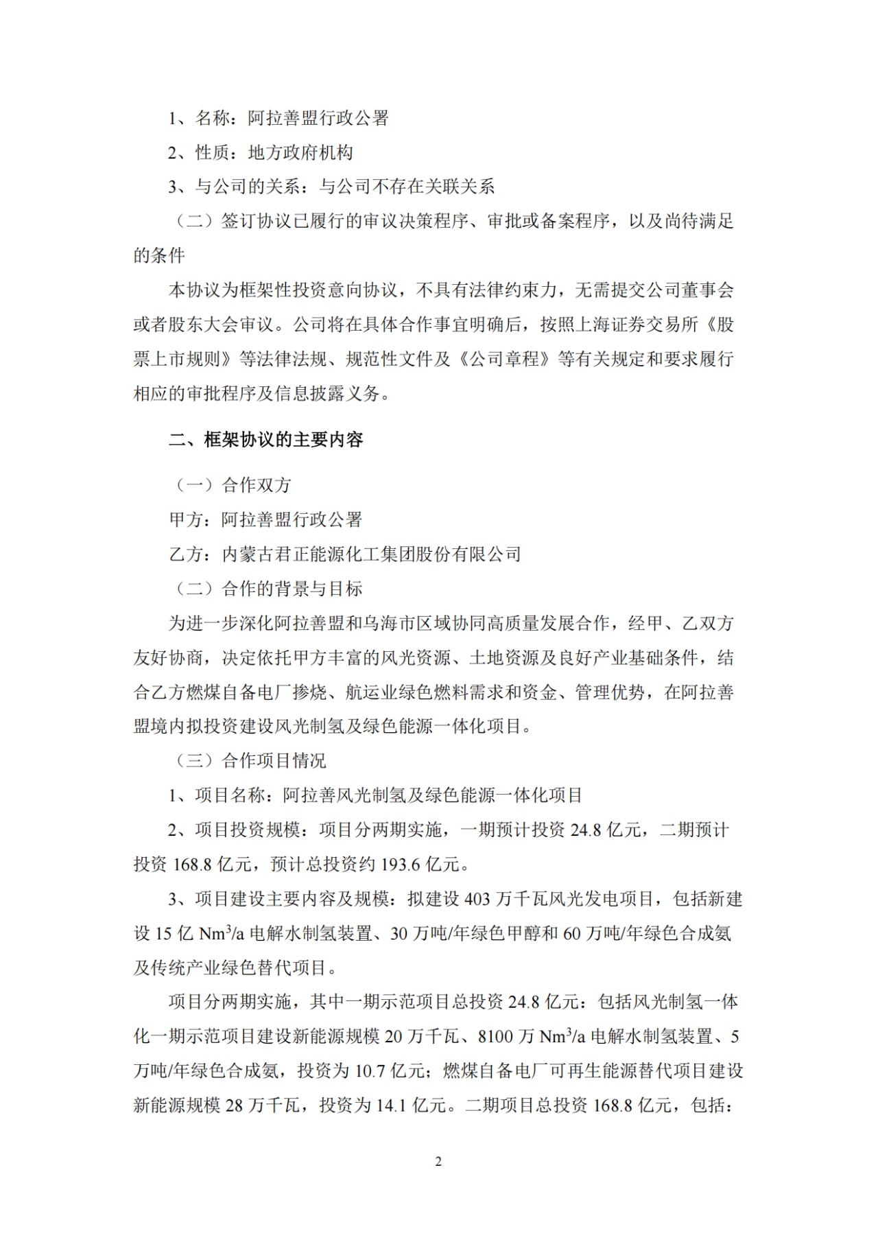 公告指出,為進(jìn)一步深化阿拉善盟和烏海市區(qū)域協(xié)同高質(zhì)量發(fā)展合作,經(jīng)甲、乙雙方友好協(xié)商,決定依托甲方豐富的風(fēng)光資源、土地資源及良好產(chǎn)業(yè)基礎(chǔ)條件,結(jié)合乙方燃煤自備電廠摻燒、航運(yùn)業(yè)綠色燃料需求和資金、管理優(yōu)勢,在阿拉善盟境內(nèi)擬投資建設(shè)風(fēng)光制氫及綠色能源一體化項(xiàng)目。