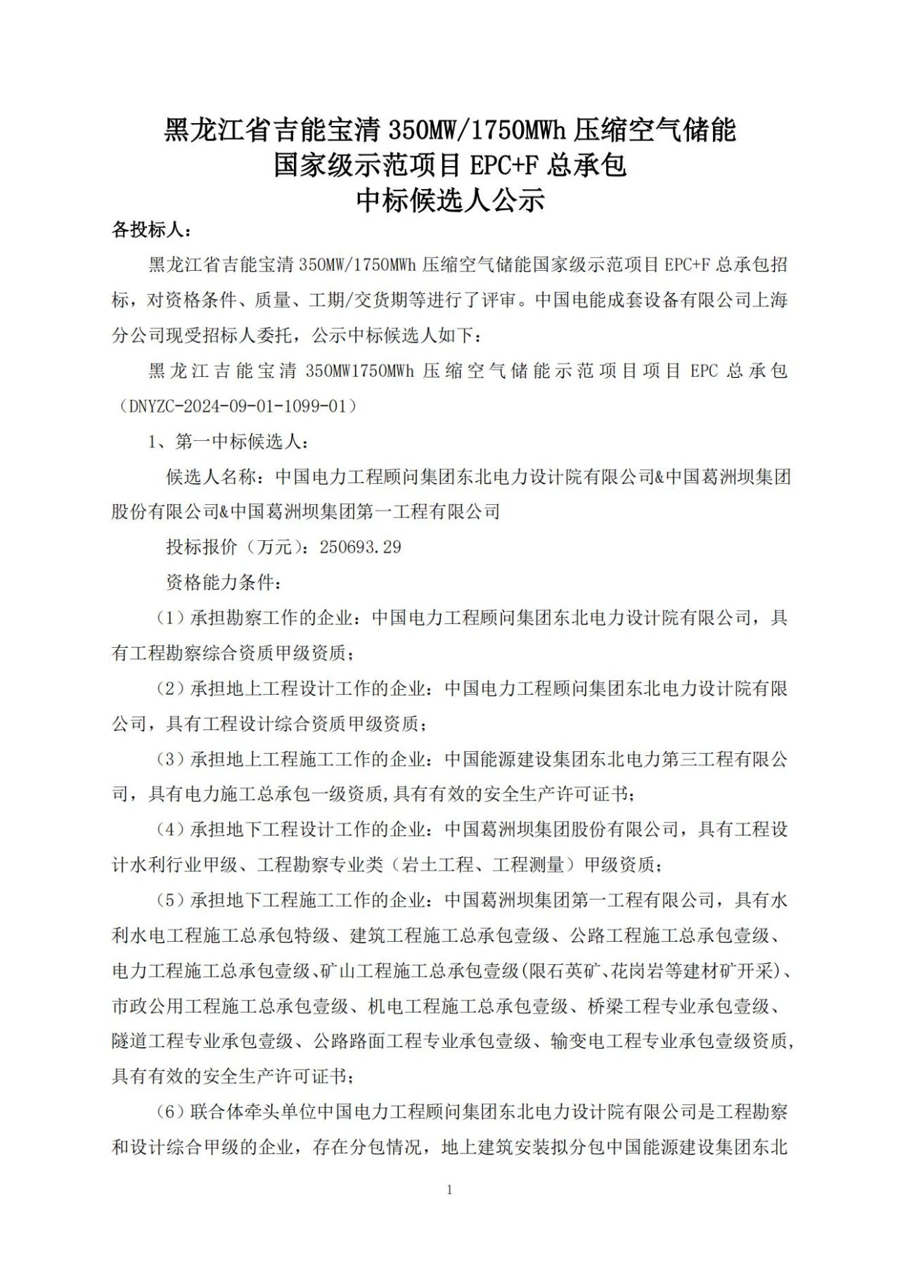 黑龍江省吉能寶清350MW/1750MWh壓縮空氣儲能國家級示范項目EPC+F進行中標候選人公示;