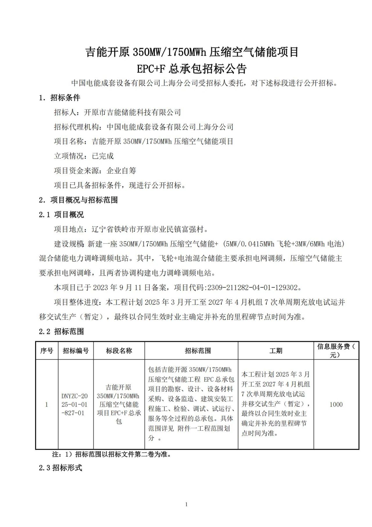 吉能開原 350MW/1750MWh壓縮空氣儲能項目EPC+F總承包招標公告;