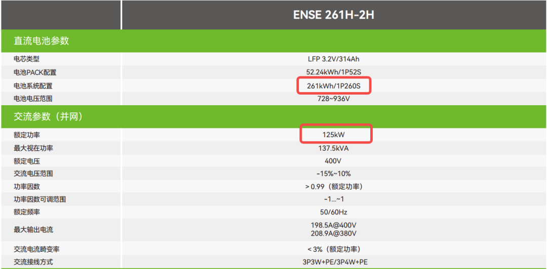容量(MWh):由電池組的總能量密度和數(shù)量決定。例如,磷酸鐵鋰電池因高循環(huán)壽命成為主流選擇,單個(gè)集裝箱儲(chǔ)能單元可達(dá)1MWh,單個(gè)儲(chǔ)能一體柜目前主流電芯314Ah,1P260S表示1并260串,即為260 * 314Ah * 3.2V = 261kWh。