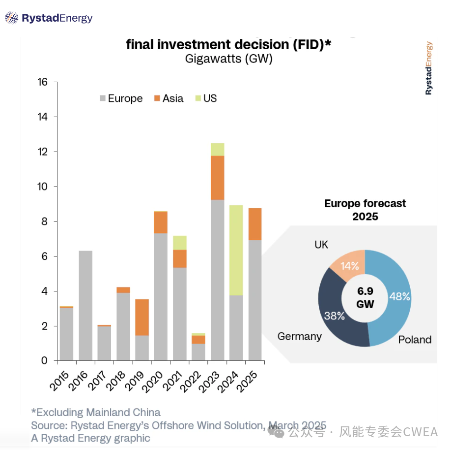 預計英國、波蘭和德國將在 2025 年引領歐洲最終投資決定的增長,將達到 9.5GW,這三個國家有多個項目正在等待最終批準。尤其是波蘭的多個大型風電場將獲得 FID,包括 Polenergia 和 Equinor 的 Baltyk II 和 III,Orsted 和 PGE 的 Baltica 2 項目。