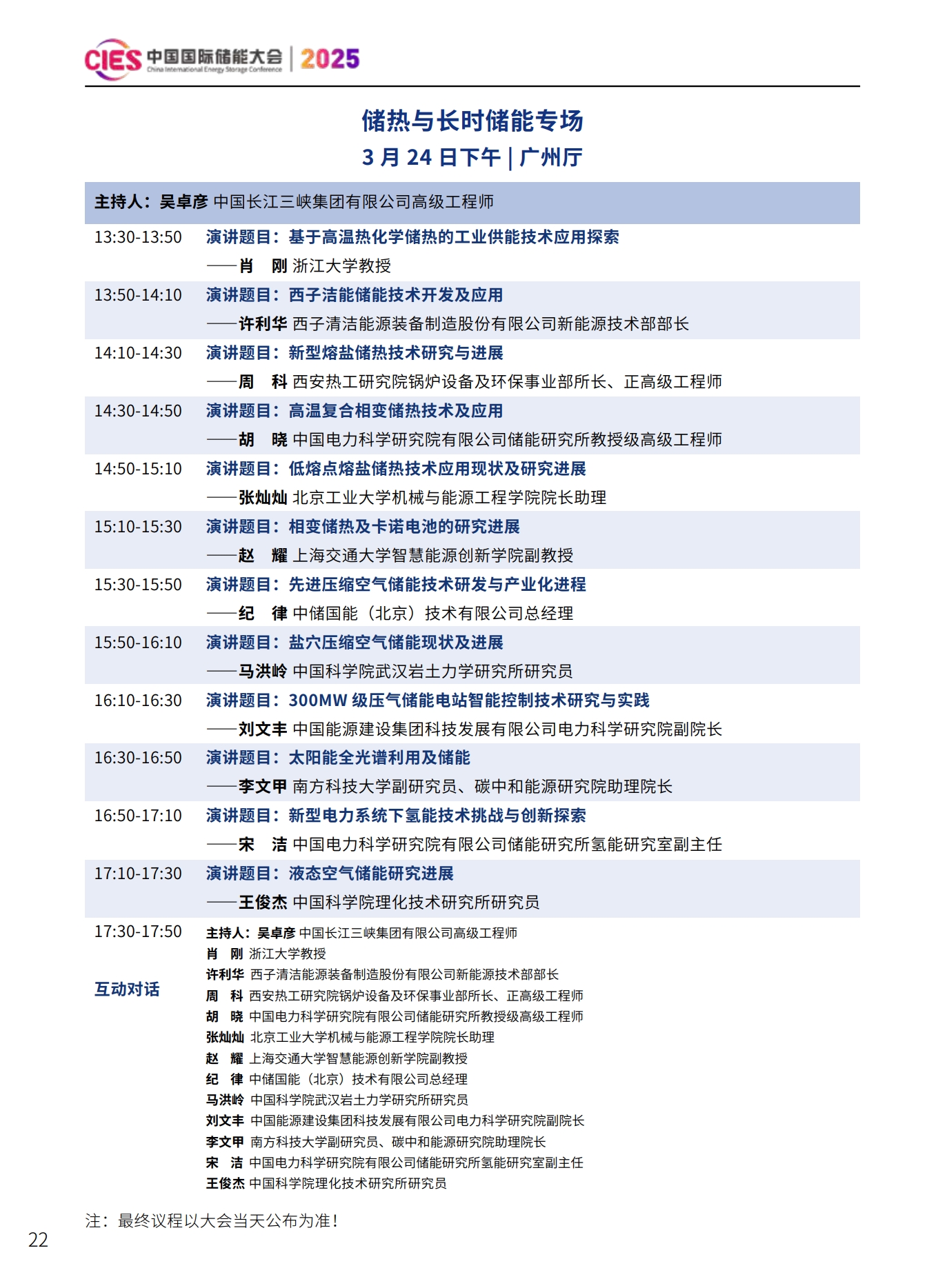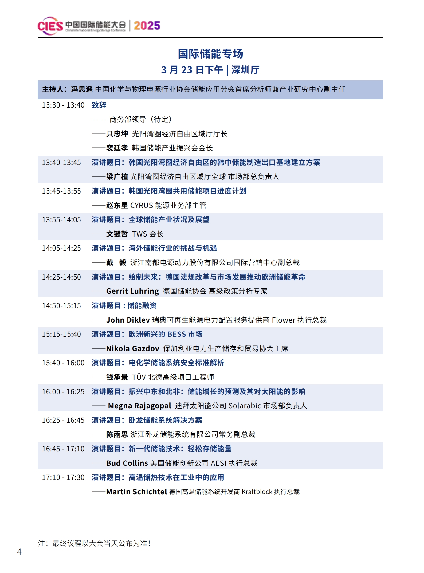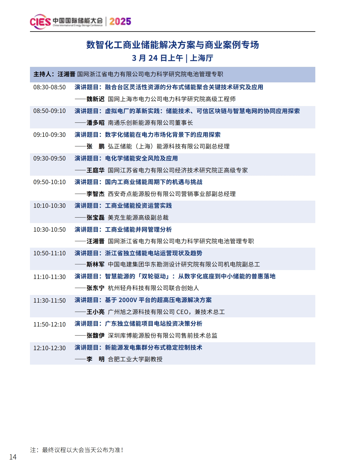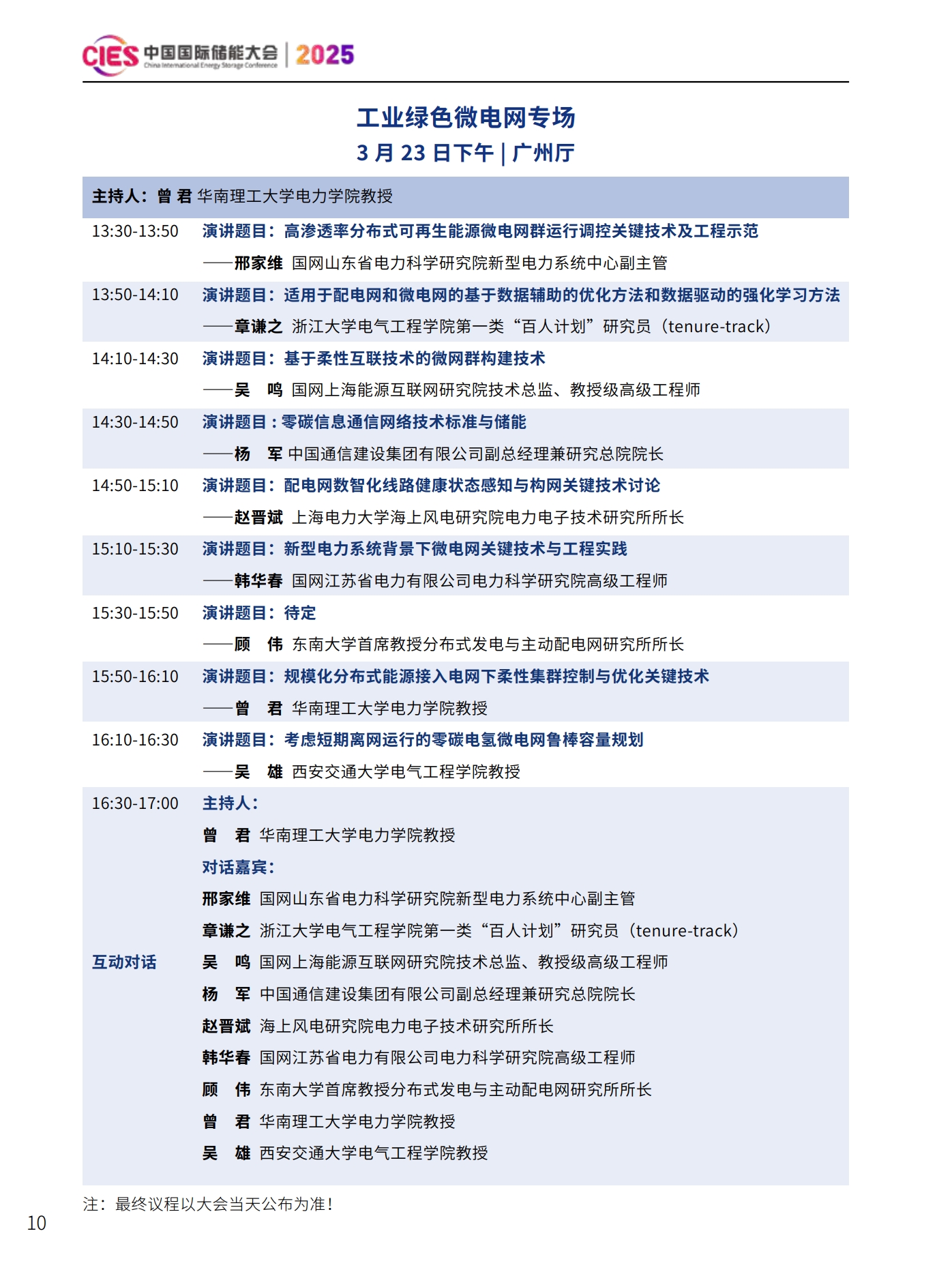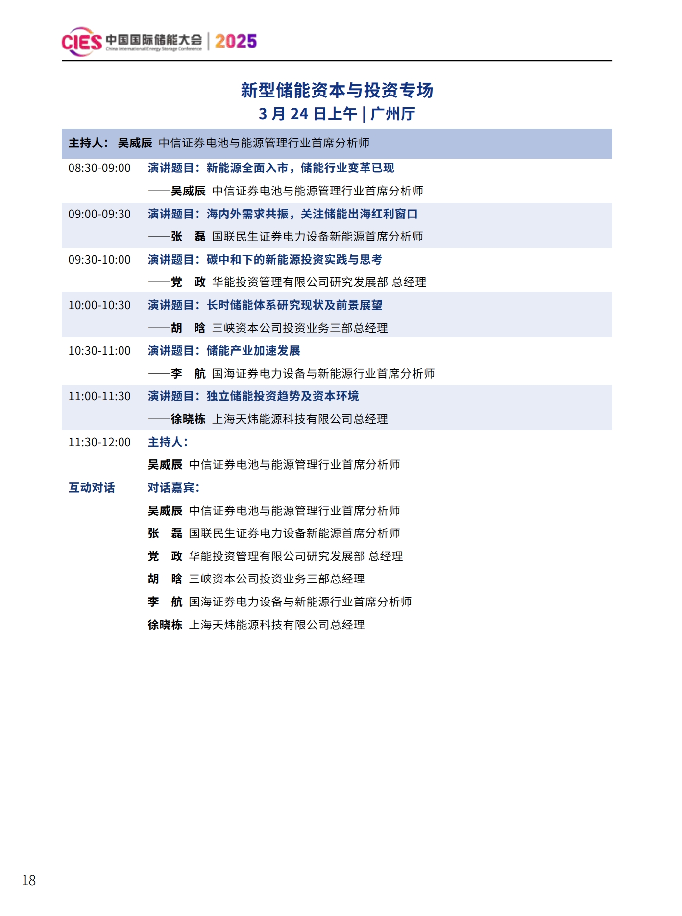CIES2025儲能大會將設置:大會開幕式暨特邀院士專家報告、數(shù)智化配電網與新型儲能融合創(chuàng)新、新型電力系統(tǒng)與并網調度、新型儲能與新能源大基地協(xié)同發(fā)展、國際儲能、電力輔助服務、現(xiàn)貨交易及容量市場、工業(yè)綠色微電網、數(shù)智化新型儲能系統(tǒng)集成解決方案(上、下)、儲能消防、安全與檢測認證、新型儲能資本與投資、液流電池、儲熱與長時儲能技術、混合儲能、全球化新型儲能供應鏈機遇與挑戰(zhàn)、數(shù)智化工商業(yè)儲能解決方案與商業(yè)案例、虛擬電廠與車網互動、構網型儲能系統(tǒng)及項目建設、儲能專用電池ESG、新產品發(fā)布等22個專場。