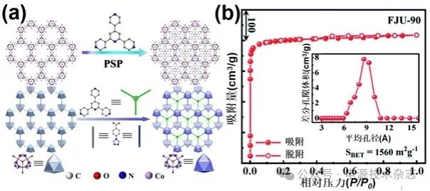 (a)FJU-88和改性后FJU-90的結(jié)構(gòu)示意圖 (b)FJU-90的N2吸脫附等溫曲線,插圖為相應(yīng)孔徑分布曲線[11]
