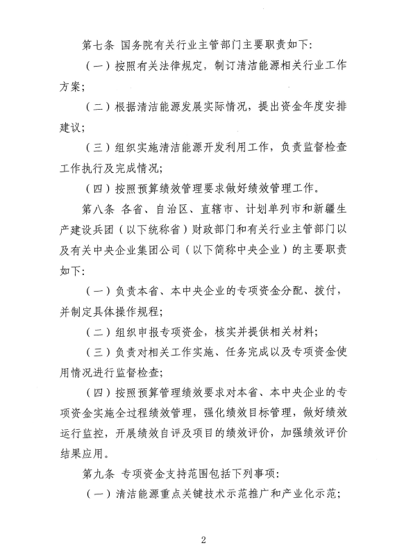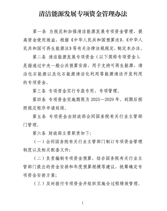 《辦法》規(guī)定,專項資金通過中央一般公共預算安排,用于支持可再生能源、清潔化石能源以及化石能源清潔化利用等能源清潔開發(fā)利用,實行??顚S?,專項管理。