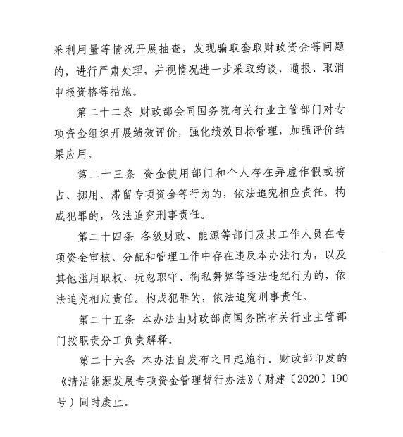中國儲能網訊:3月12日,財政部印發(fā)《清潔能源發(fā)展專項資金管理辦法》(財建〔2025〕35號),要求規(guī)范和加強清潔能源發(fā)展專項資金管理,提高資金使用效益?!掇k法》自發(fā)布之日起施行,此前財政部印發(fā)的《清潔能源發(fā)展專項資金管理暫行辦法》(財建〔2020〕190號)同時廢止。