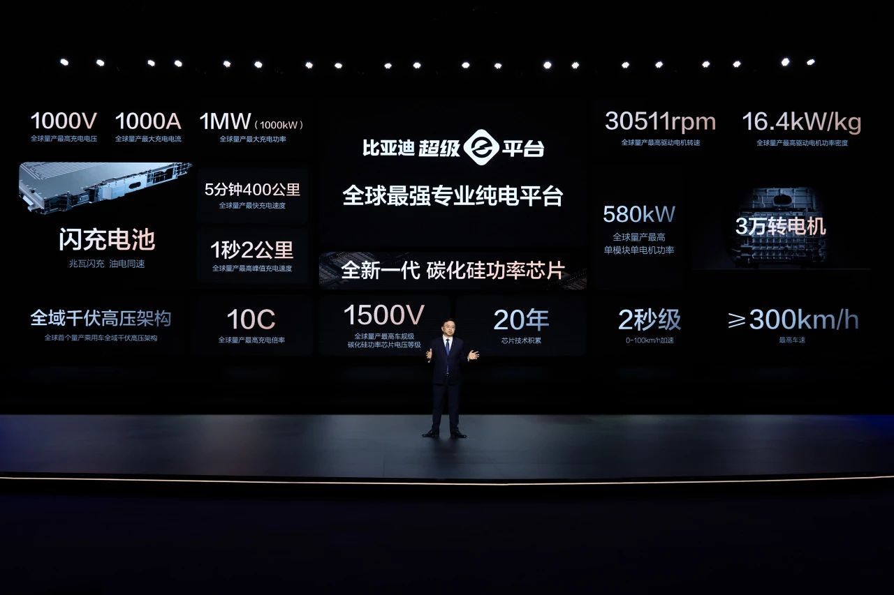 中國儲能網(wǎng)訊:2025年3月17日,比亞迪召開超級e平臺技術(shù)發(fā)布暨漢L、唐L預(yù)售發(fā)布會,發(fā)布劃時代超級e平臺,推出閃充電池、3萬轉(zhuǎn)電機(jī)和全新一代車規(guī)級碳化硅功率芯片,核心三電全維升級,刷新多項(xiàng)全球之最。在充電速度上,實(shí)現(xiàn)充電功率1兆瓦(1000kW),實(shí)現(xiàn)全球量產(chǎn)最高峰值充電速度1秒2公里,達(dá)到全球量產(chǎn)最快充電速度——閃充5分鐘,暢行400公里;在性能上,達(dá)到單模塊單電機(jī)功率580kW,最高車速超300km/h,定義全球最強(qiáng)專業(yè)純電平臺,首發(fā)搭載于劃時代旗艦漢L、唐L,即日起正式開啟預(yù)售,引領(lǐng)電動車下一個時代。