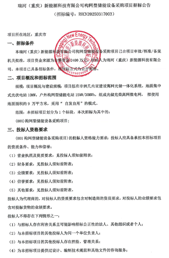 中國儲(chǔ)能網(wǎng)訊:3月18日,瑞河(重慶)新能源科技有限公司發(fā)布15MW/30MWh構(gòu)網(wǎng)型儲(chǔ)能設(shè)備采購項(xiàng)目招標(biāo)公告。包括完成設(shè)備的供貨(設(shè)計(jì)、制造,含備品、備件等)、裝配(含出廠前組裝、測試和檢驗(yàn)等)、裝卸、運(yùn)輸(含包裝、保險(xiǎn))、指導(dǎo)安裝、調(diào)試、驗(yàn)收,以及質(zhì)量保證期內(nèi)的維修、維護(hù)、保養(yǎng)、人員培訓(xùn)等支持和其它相關(guān)伴隨服務(wù)等工作內(nèi)容。