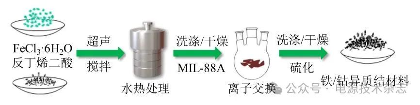 相較于其他合成雙金屬組分異質(zhì)結(jié)的方法,離子交換法在使用條件下相對(duì)溫和,過(guò)程可控性更高,并能夠在一定程度上保留前驅(qū)體的基本形貌和結(jié)構(gòu),因此在納米合成領(lǐng)域受到廣泛的關(guān)注[18-19]?;谝陨戏治?,本文選用可控性更高的離子交換過(guò)程合成了鐵鈷雙金屬硫化物異質(zhì)結(jié),通過(guò)控制離子交換時(shí)間,得到了不同組分相對(duì)含量可控的異質(zhì)結(jié)材料,并研究了不同樣品儲(chǔ)鈉性能的差異。