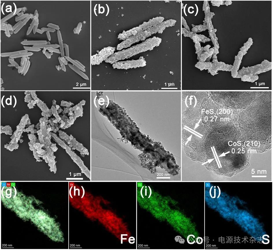 圖3(a)為前驅(qū)體MIL-88A的SEM圖,可以看出,未經(jīng)處理的MIL-88A前驅(qū)體表現(xiàn)出單分散的棱柱狀結(jié)構(gòu),這與文獻(xiàn)報(bào)道一致[24]。圖3(b)~(d)分別為樣品FC-2、FC-4和FC-6的SEM圖,可以看出,經(jīng)過(guò)后續(xù)離子交換和硫化處理,目標(biāo)樣品的表面變得較為粗糙。樣品FC-2和FC-4相對(duì)較好地保持了前驅(qū)體MIL-88A的棱柱狀結(jié)構(gòu),而樣品FC-6的棱柱狀結(jié)構(gòu)遭到破壞,且出現(xiàn)一定程度的團(tuán)聚。圖3(e)為樣品FC-4的TEM圖,可以看出,目標(biāo)樣品表現(xiàn)出小顆粒組裝成的柱狀結(jié)構(gòu),其長(zhǎng)度約為2 μm。圖3(f)為FC-4的高分辨率透射電鏡圖(HRTEM)圖,可以觀察到晶格間距為0.27和0.25 nm的晶格條紋,分別對(duì)應(yīng)的是FeS2的(200)晶面和CoS2的(210)晶面[25-26]。此外,F(xiàn)eS2顆粒和CoS2顆粒界面緊密接觸,形成異質(zhì)結(jié),這對(duì)電化學(xué)儲(chǔ)鈉性能的提升是有利的[11,27-28]。圖3(g)~(j)給出了樣品FC-4的能量色散X射線譜(EDS)元素分布照片,可以看出,元素鐵、鈷和硫的分布完全一致,這一結(jié)果也很好地佐證了經(jīng)過(guò)離子交換過(guò)程,鈷離子進(jìn)入到了目標(biāo)樣品中。