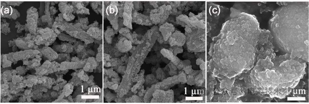 為直觀揭示樣品電化學(xué)循環(huán)性能的差異,表征了樣品在循環(huán)150次以后的SEM圖,如圖6所示,可以看出,樣品FC-2和FC-4循環(huán)后基本能夠保持原有的形貌,而樣品FC-6在循環(huán)后,其原有的棱柱狀結(jié)構(gòu)坍塌,同時(shí)活性組分出現(xiàn)團(tuán)聚,這與其電化學(xué)儲(chǔ)鈉性能迅速衰減直接相關(guān)[33]。