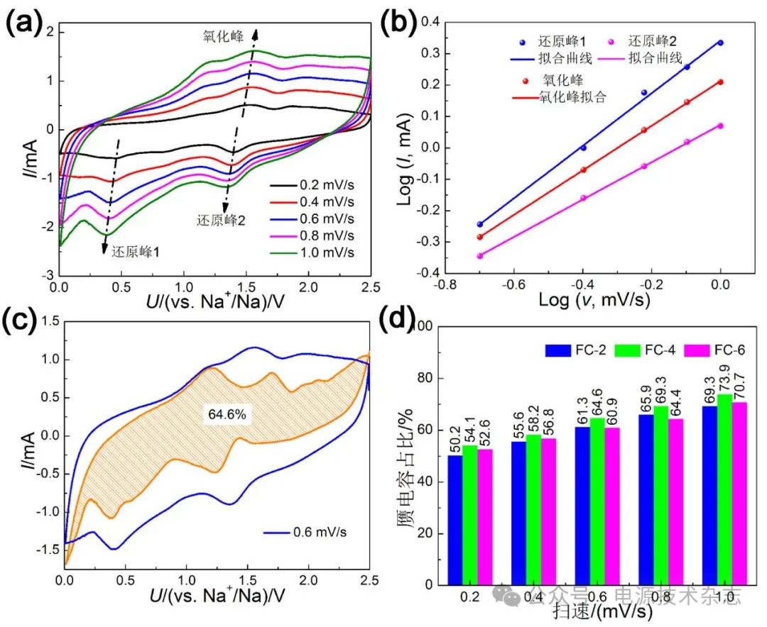 為深入揭示所制備樣品的儲(chǔ)鈉機(jī)理,記錄了所制備樣品在不同掃描速率下的CV曲線,其中,樣品FC-4在不同掃速下的CV曲線如圖7(a)所示,CV曲線中的峰值電流i和掃描速度v具有式(1)所示的線性關(guān)系。進(jìn)一步地,對(duì)樣品FC-4的log(i)和log(v)進(jìn)行擬合,結(jié)果如圖7(b)所示,氧化峰、還原峰1和還原峰2的斜率分別為0.71、0.83和0.61,其值介于0.5~1,表明樣品FC-4的儲(chǔ)鈉機(jī)制包含擴(kuò)散控制過(guò)程和贗電容儲(chǔ)鈉過(guò)程[35-36]。贗電容貢獻(xiàn)比例可以根據(jù)式(2)得到,其中,i(V)為特定電壓下總的電流值,k1v和k2v1/2分別代表的是贗電容儲(chǔ)鈉過(guò)程和擴(kuò)散控制儲(chǔ)鈉過(guò)程。圖7(c)所示為樣品FC-4在0.6 mV/s掃速下的贗電容貢獻(xiàn)占比,其值為64.6%。進(jìn)一步使用相同的方法,分析計(jì)算了所有樣品的贗電容貢獻(xiàn)占比,結(jié)果如圖7(d)所示,樣品FC-4的贗電容貢獻(xiàn)占比最高。較高的贗電容儲(chǔ)鈉貢獻(xiàn)有利于倍率性能和循環(huán)穩(wěn)定性的提升[37-38]。