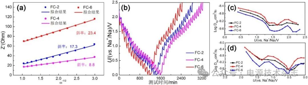圖8 不同樣品的ZRe和ω1/2的線性關(guān)系(a)、GITT曲線(b)、充電過(guò)程(c)和放電過(guò)程(d)中的鈉離子擴(kuò)散系數(shù)