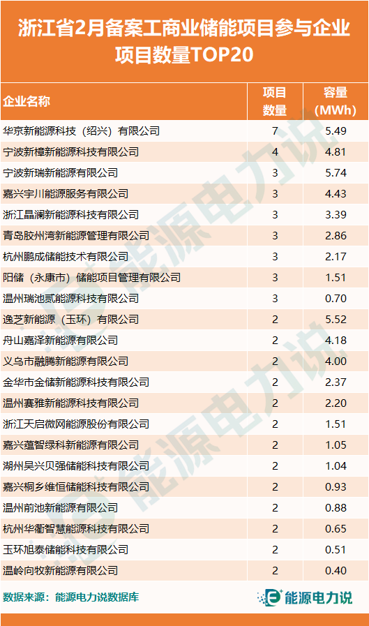 2月備案工商業(yè)儲(chǔ)能項(xiàng)目參與企業(yè)包括:華京新能源、寧波新樟新能源、寧波新瑞新能源、嘉興宇川能源、浙江晶瀾新能源、青島膠州灣新能源、杭州鵬成儲(chǔ)能、陽(yáng)儲(chǔ)儲(chǔ)能、溫州瑞池貳能源等。