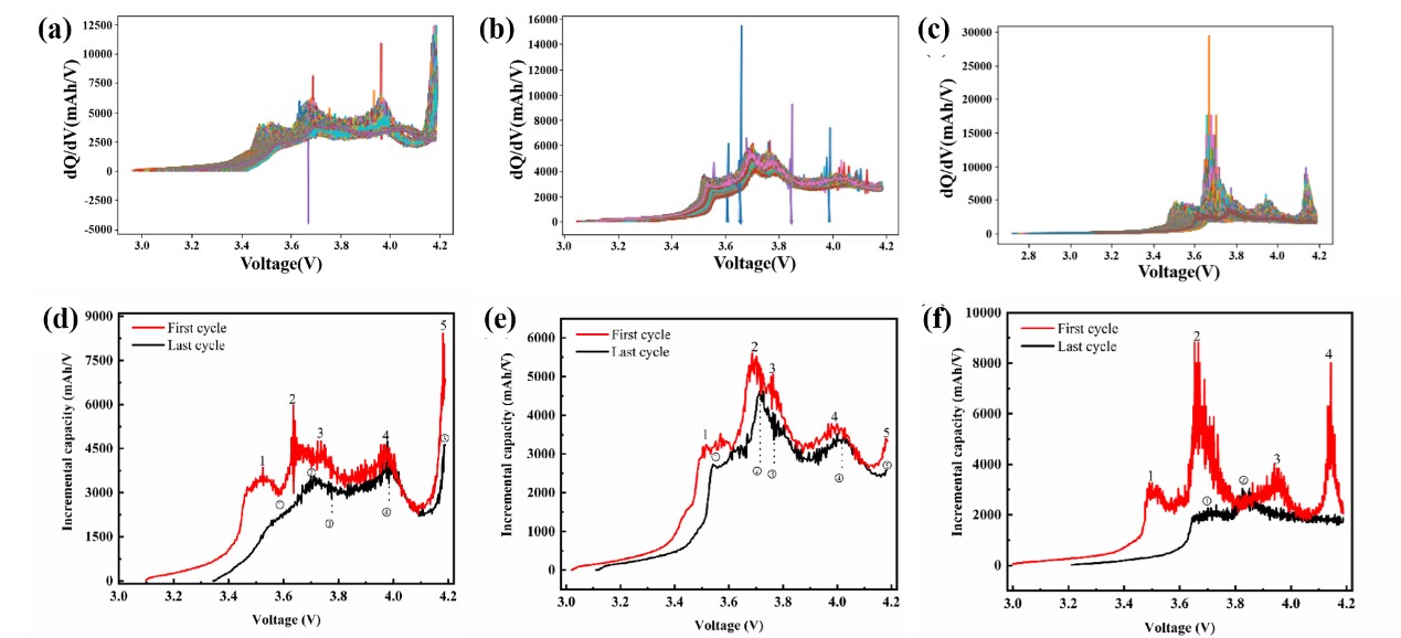 數(shù)據(jù)集3的電池采用NCM+NCA混合正極和石墨負(fù)極,其中一個(gè)電池的首末圈IC曲線變化趨勢(shì)如圖2f所示。IC曲線的每個(gè)峰均顯著右移,表明各相變過(guò)程對(duì)應(yīng)的平臺(tái)電壓顯著升高,反映了電池內(nèi)阻的大幅增加。四個(gè)特征峰均隨循環(huán)顯著衰減。特征峰1(3.50 V)、峰2(3.68 V)和峰3(3.96 V)分別對(duì)應(yīng)石墨負(fù)極的脫鋰反應(yīng)、NCM/NCA正極的嵌鋰反應(yīng)以及三元材料的副反應(yīng)。特征峰4由于內(nèi)阻較高,因此相應(yīng)的相變過(guò)程轉(zhuǎn)移至恒壓充電階段,導(dǎo)致該峰從IC曲線中消失。綜上所述,電池內(nèi)阻的顯著增加、正負(fù)極活性材料的損失以及副反應(yīng)和SEI膜生長(zhǎng)導(dǎo)致的活性鋰離子損失共同導(dǎo)致了電池的容量衰減。
