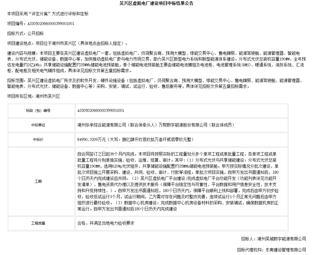 公告顯示,湖州華承綜合能源有限公司、萬幫數(shù)字能源股份有限公司聯(lián)合體以投標報價84990.3209萬元中標。