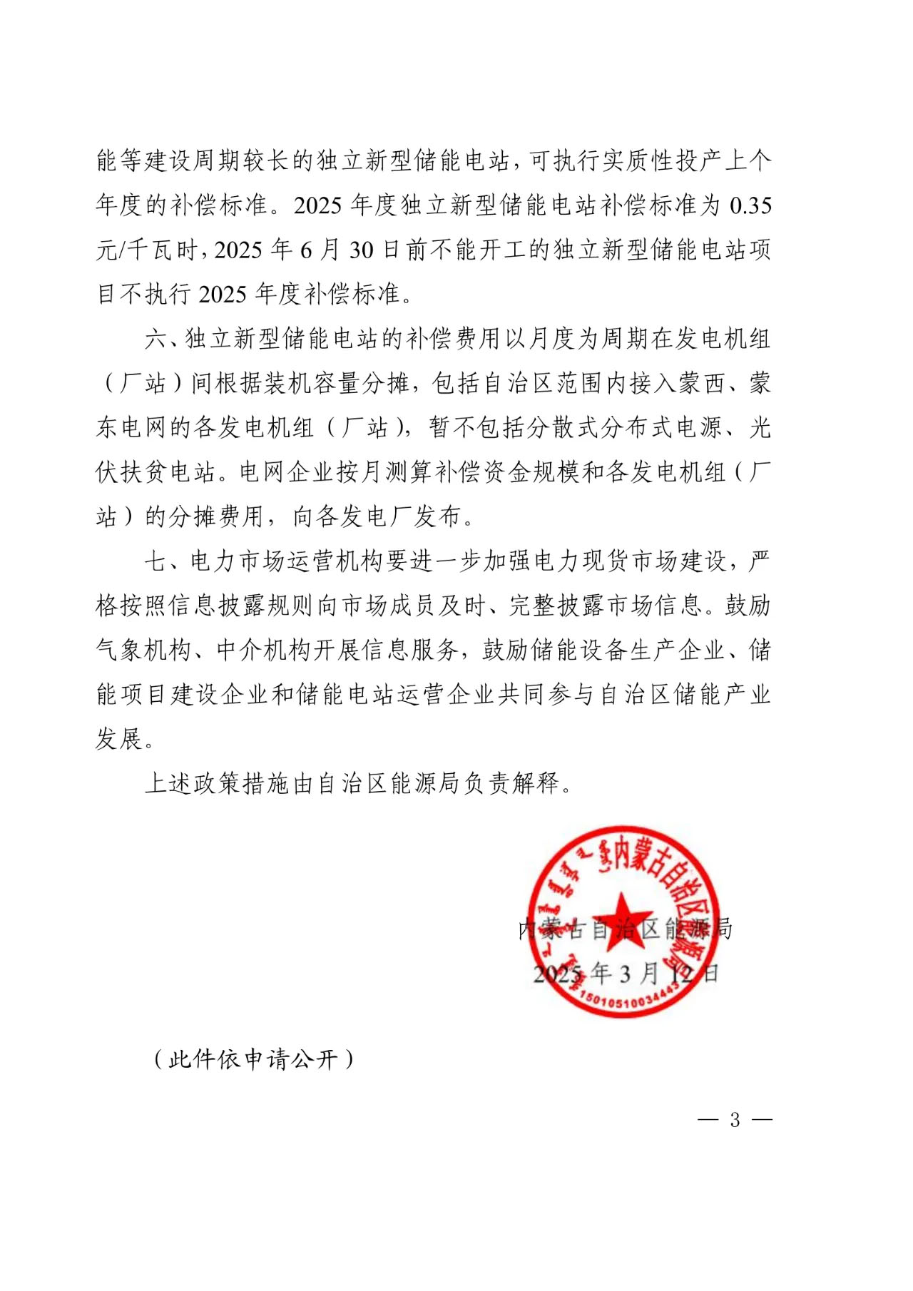 獨(dú)立新型儲(chǔ)能電站向公用電網(wǎng)的放電量執(zhí)行實(shí)質(zhì)性投產(chǎn)(以額定功率進(jìn)行3個(gè)充放電循環(huán)、連續(xù)并網(wǎng)試運(yùn)行時(shí)間不小于72小時(shí),下同)年度的補(bǔ)償標(biāo)準(zhǔn),壓縮空氣儲(chǔ)能、液流電池儲(chǔ)能等建設(shè)周期較長的獨(dú)立新型儲(chǔ)能電站,可執(zhí)行實(shí)質(zhì)性投產(chǎn)上個(gè)年度的補(bǔ)償標(biāo)準(zhǔn)。2025年度獨(dú)立新型儲(chǔ)能電站補(bǔ)償標(biāo)準(zhǔn)為0.35元/kWh,2025年6月30日前不能開工的獨(dú)立新型儲(chǔ)能電站項(xiàng)目不執(zhí)行2025年度補(bǔ)償標(biāo)準(zhǔn)。