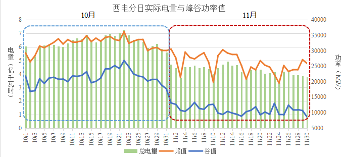 圖1:西電分日實(shí)際電量與峰谷功率值(單位:億千瓦時(shí),兆瓦)