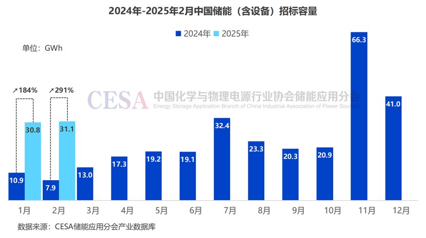 盡管通常一季度為淡季,但2025年以來國內(nèi)儲(chǔ)能招投標(biāo)市場(chǎng)依舊相當(dāng)火爆。據(jù)CESA儲(chǔ)能應(yīng)用分會(huì)產(chǎn)業(yè)數(shù)據(jù)庫不完全統(tǒng)計(jì),2025年1月、2月國內(nèi)儲(chǔ)能(含直流側(cè)設(shè)備)招標(biāo)規(guī)模分別為8.98GW/30.8GWh、7.99GW/31.08GWh,容量規(guī)模同比增長184%、291%,其中包括多個(gè)儲(chǔ)能電芯/系統(tǒng)集采招標(biāo)項(xiàng)目。