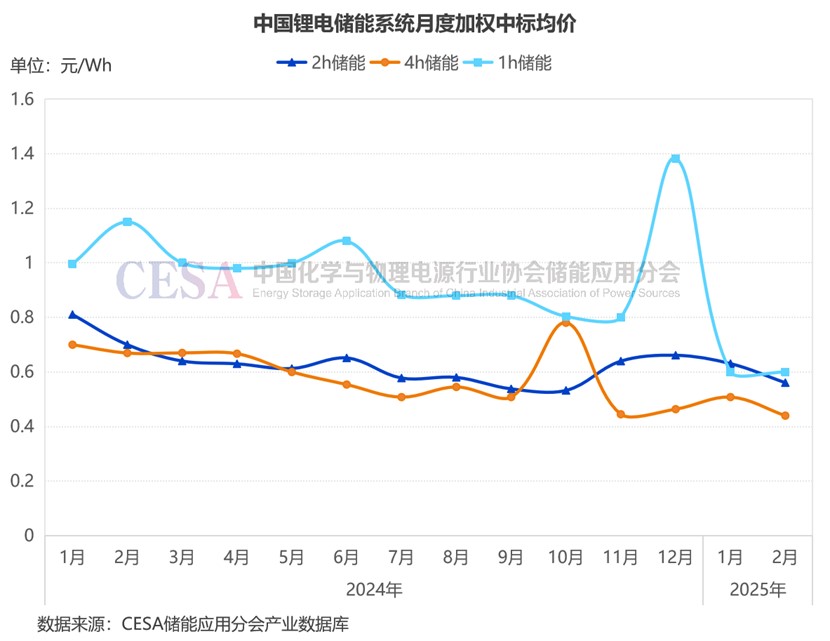 2025年2月,鋰電儲(chǔ)能EPC入圍投標(biāo)單價(jià)主要集中在0.5955-1.37元/Wh,平均報(bào)價(jià)0.9356元/Wh,中標(biāo)加權(quán)均價(jià)0.9447元/Wh,環(huán)比-13.53%。