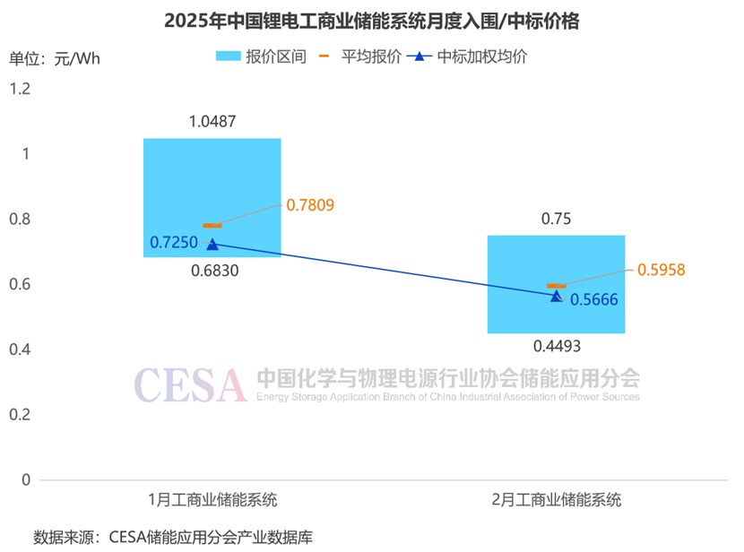 2025年2月鋰電儲(chǔ)能系統(tǒng)入圍投標(biāo)報(bào)價(jià)范圍為0.426-0.6345元/Wh,平均報(bào)價(jià)0.5065元/Wh,中標(biāo)加權(quán)均價(jià)0.4895元/Wh,環(huán)比-2.07%。