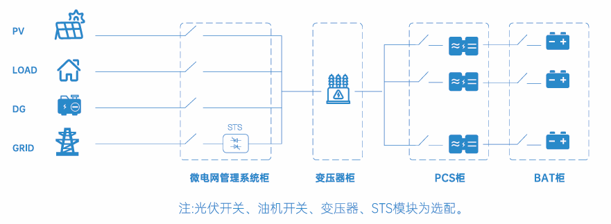 通過集中管理油機(jī)、光伏、負(fù)載及市電的控制斷路器,實(shí)現(xiàn)并離網(wǎng)無縫切換。這種設(shè)計(jì)不僅提升了系統(tǒng)穩(wěn)定性和可靠性,并優(yōu)化了能源配置,實(shí)現(xiàn)光伏、油機(jī)、市電等多種能源的高效整合與智能分配。