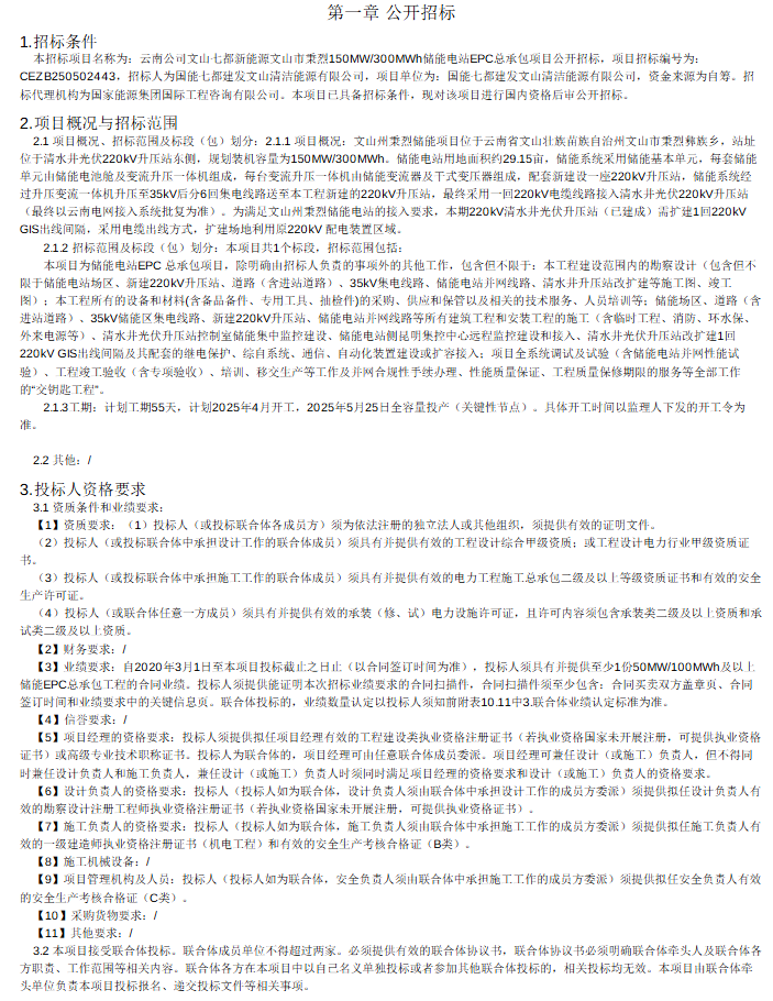業(yè)績(jī)要求投標(biāo)人必須提供至少一份50MW/100MWh及以上的儲(chǔ)能EPC總承包工程的合同。