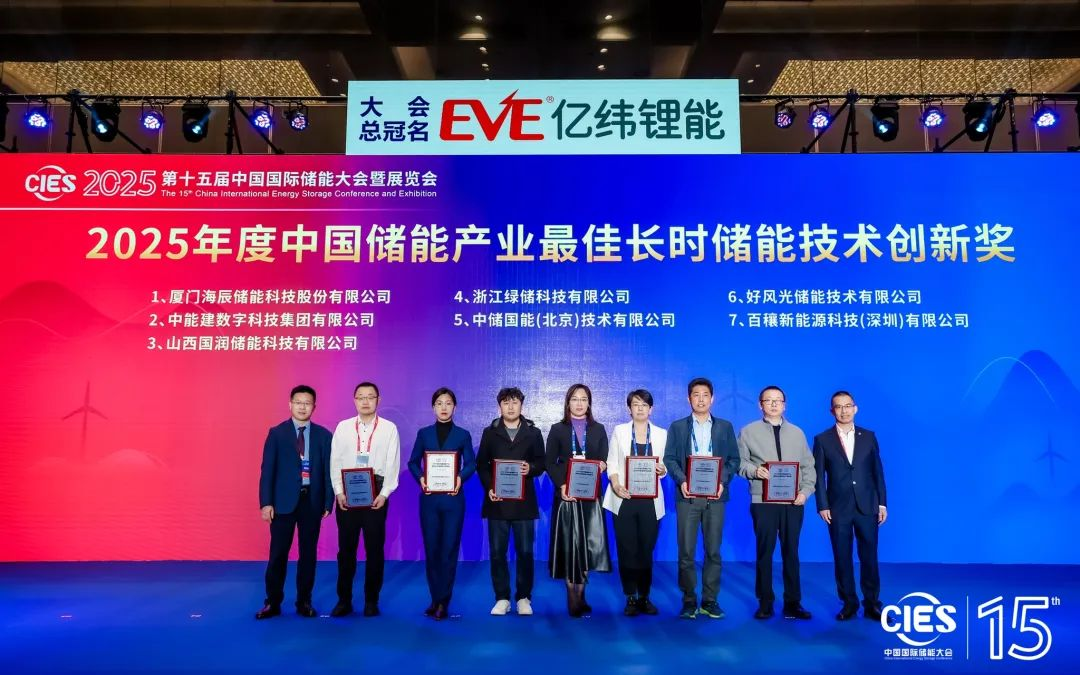 在頒獎盛典上,浙江綠儲科技有限公司榮膺2025年度中國儲能產(chǎn)業(yè)最佳長時儲能技術創(chuàng)新獎!除綠儲科技之外,同獲該獎項的還有中能建、中儲國能等6家長時儲能業(yè)界同仁。