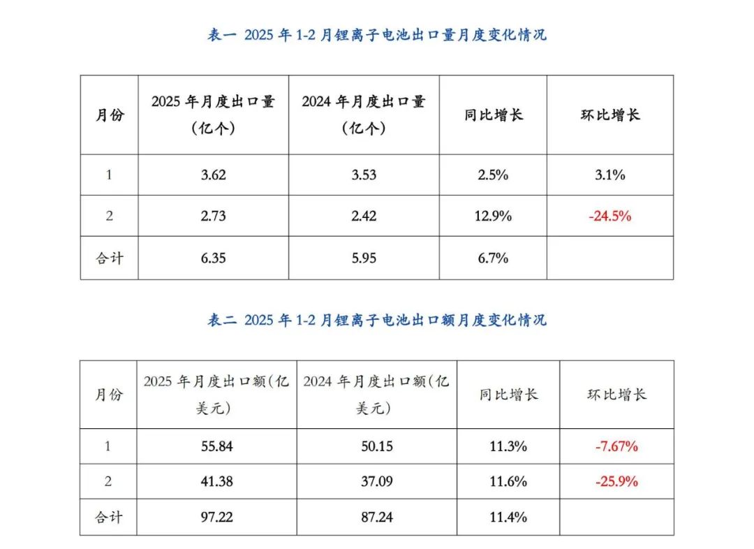 中國儲能網(wǎng)訊:2025年1-2月鋰離子電池出口數(shù)量為6.35億個,同比增長12.9%;2025年1-2月我國鋰離子電池出口額為97.22億美元,同比增加11.4%,出口總體態(tài)勢良好。其中,2025年1、2月份出口額環(huán)比分別下降7.67%和25.9%,據(jù)分析,由于企業(yè)可能在節(jié)前集中完成訂單,春節(jié)假期導致生產(chǎn)與出口節(jié)奏放緩,進而影響出口環(huán)比表現(xiàn)。出口“量增價減”趨勢延續(xù),尤其是在國際市場競爭加劇的背景下,企業(yè)可能通過降價策略爭奪市場份額。2024年碳酸鋰等原材料價格下行,傳導至出口價格存在滯后性,企業(yè)可能通過降價清庫存或提前鎖定低價訂單,進一步壓縮利潤空間。