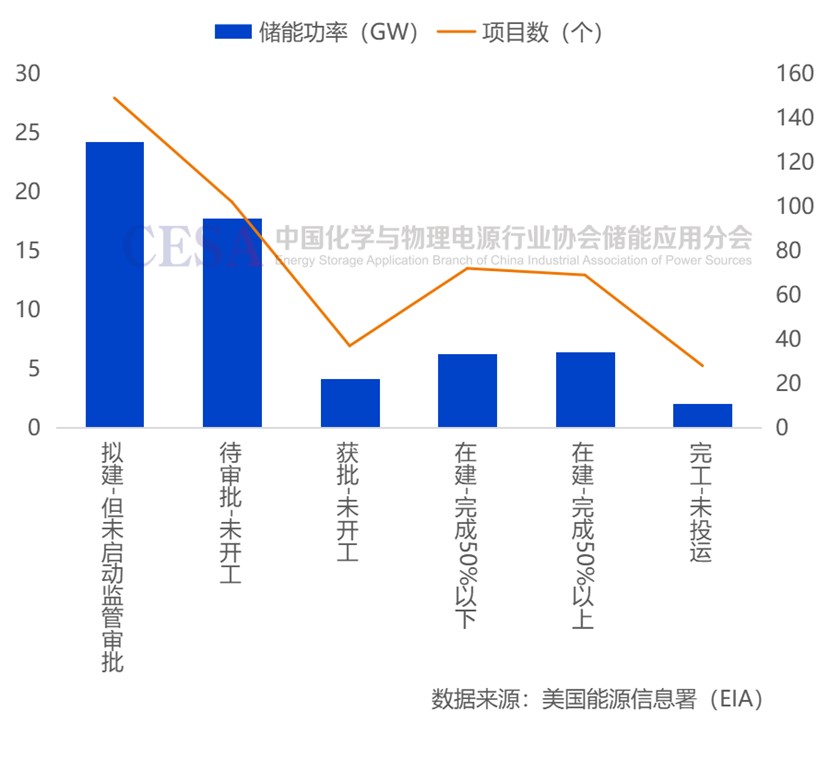 圖 美國(guó)擬在建電池儲(chǔ)能項(xiàng)目各區(qū)域規(guī)模分布及進(jìn)度
