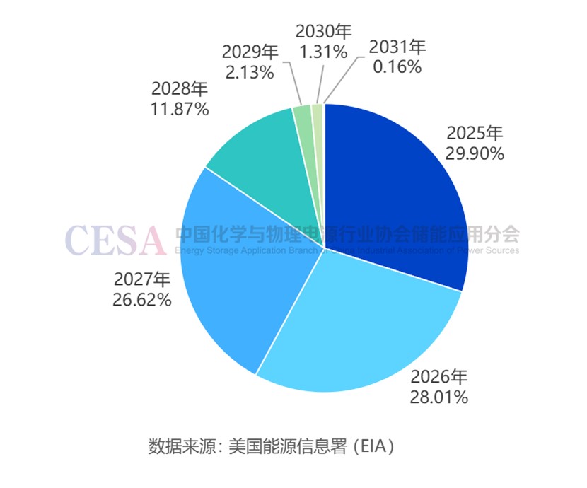 圖 美國(guó)擬在建項(xiàng)目不同年份計(jì)劃投運(yùn)規(guī)模占比
