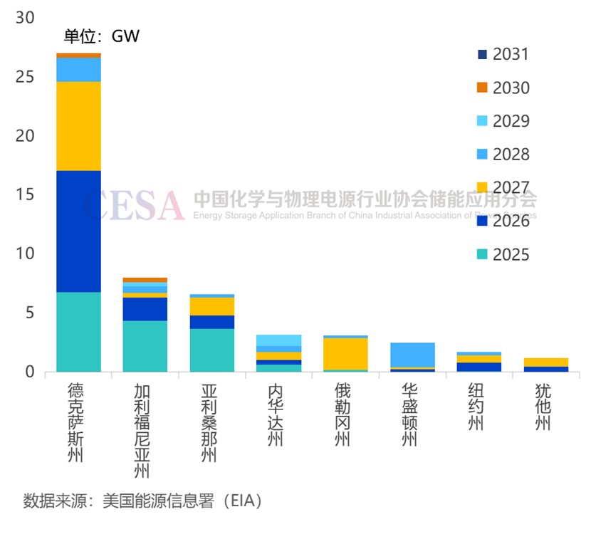 圖 美國(guó)各州擬在建電池儲(chǔ)能項(xiàng)目計(jì)劃投運(yùn)時(shí)間及規(guī)模