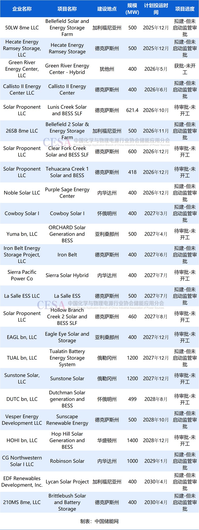 德克薩斯州希爾縣Midpoint 50MW/127MWh光儲(chǔ)項(xiàng)目、德克薩斯州納瓦羅縣Gaia 76.8MW/188MWh光儲(chǔ)項(xiàng)目