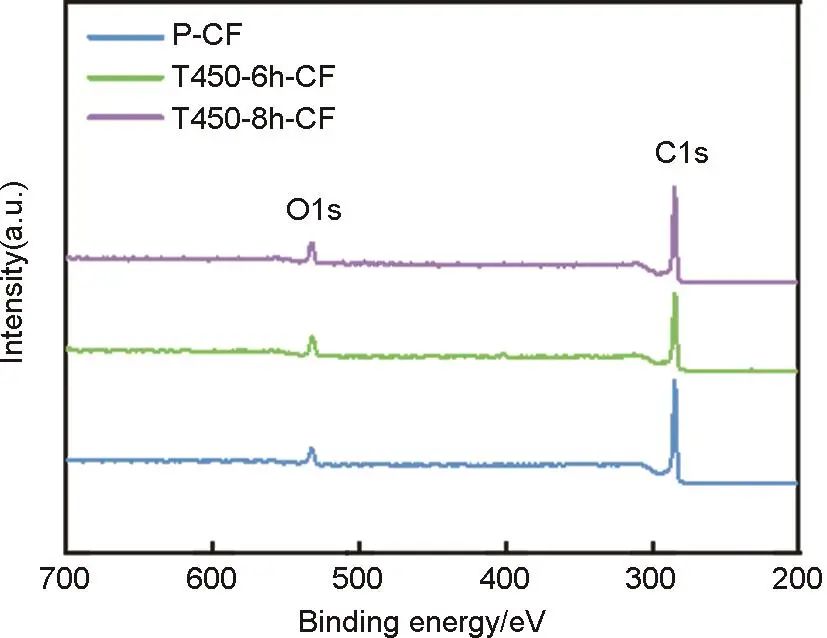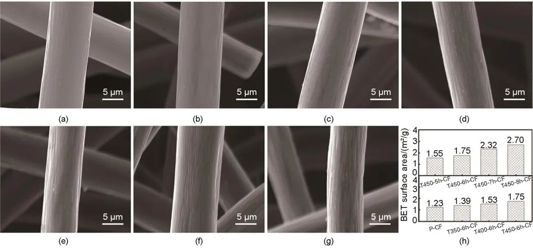 首先,對(duì)低溫長(zhǎng)時(shí)處理樣品進(jìn)行了掃描電鏡分析。圖3(a)~(d)給出了原始碳?xì)?P-CF)、T350-6h-CF、T400-6h-CF和T450-6h-CF的SEM圖像??梢钥吹?,原始碳?xì)值奶祭w維表面光滑且不存在缺陷。在熱處理保溫時(shí)長(zhǎng)均為6 h的情況下,隨熱處理溫度升高,碳?xì)直砻嫘蚊参窗l(fā)生明顯變化。進(jìn)一步,當(dāng)熱處理溫度恒定為450 ℃時(shí),隨保溫時(shí)間由5 h增加到8 h[圖3(d)~(g)],樣品纖維表面逐漸出現(xiàn)一些尺度較大的溝壑狀缺陷,即處理時(shí)長(zhǎng)增加將導(dǎo)致碳纖維表面粗糙度增加。需要注意,保溫處理時(shí)間過(guò)長(zhǎng),產(chǎn)生的大尺度缺陷會(huì)影響碳?xì)掷w維的機(jī)械穩(wěn)定性。圖3(h)進(jìn)一步對(duì)比展示了以上全部材料的BET比表面積,反映出與SEM測(cè)試相似的結(jié)論,即增加處理溫度對(duì)碳?xì)直缺砻娣e的影響較小,而增加處理時(shí)長(zhǎng)能夠更為明顯地增大比表面積。因此,對(duì)于低溫長(zhǎng)時(shí)處理(350~450 ℃,5~8 h),樣品形貌對(duì)熱處理保溫時(shí)間更為敏感,適當(dāng)增加保溫時(shí)長(zhǎng)有助于改善碳?xì)掷w維的活性表面積。