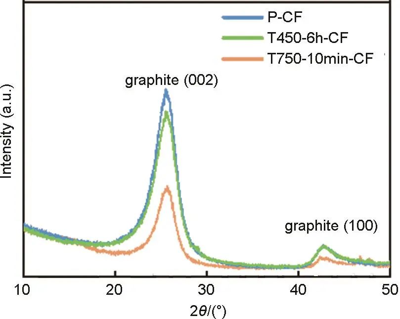 為進(jìn)一步分析熱處理工藝對(duì)碳?xì)志w結(jié)構(gòu)的影響,開(kāi)展了X射線衍射分析。圖6展示的是原始碳?xì)?P-CF)、T450-6h-CF、T750-10min-CF三個(gè)典型樣品的XRD曲線??梢钥吹?,三個(gè)碳?xì)謽悠肪?5.6°和42.7°處出現(xiàn)衍射峰,分別對(duì)應(yīng)石墨(002)面和石墨(100)面。低溫長(zhǎng)時(shí)處理的碳?xì)?T450-6h-CF)衍射峰強(qiáng)度與原始碳?xì)窒嘟?,表明低溫長(zhǎng)時(shí)處理對(duì)碳?xì)衷械氖w結(jié)構(gòu)不會(huì)產(chǎn)生明顯影響。與之相反,經(jīng)高溫短時(shí)處理的碳?xì)?T750-10min-CF)衍射峰強(qiáng)度明顯低于原始碳?xì)郑锤邷責(zé)崽幚頃?huì)顯著降低碳?xì)蛛姌O的石墨化度,破壞纖維的晶體結(jié)構(gòu)。