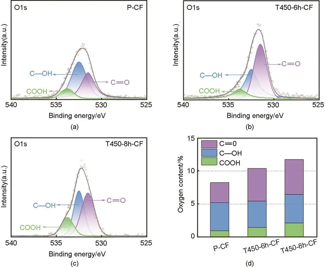 圖8 碳?xì)值腛1s分峰擬合圖:(a) P-CF,(b) T450-6h-CF,(c) T450-8h-CF;(d) 各含氧官能團(tuán)的含量