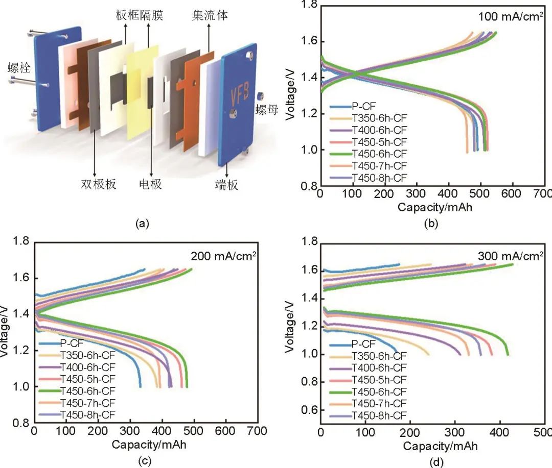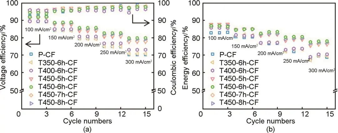 為對(duì)比分析活化電極的電池循環(huán)性能,分別用P-CF和低溫長(zhǎng)時(shí)熱處理碳?xì)蛛姌O組裝了單電池,電池結(jié)構(gòu)如圖11(a)所示。在100 mA/cm2、200 mA/cm2和300 mA/cm2電流密度下,測(cè)得組裝電池的充放電曲線[圖11(b)~(d)]。結(jié)果表明,三種電流密度下,由T450-6h-CF組裝的電池具有更低的充電電壓和更高的放電電壓,表現(xiàn)出更大的充放電容量。例如,300 mA/cm2電流密度下,T450-6h-CF的放電容量為417.9 mAh,明顯優(yōu)于P-CF的173.0 mAh,且優(yōu)于其他活化電極(例如T450-8h-CF:357.3 mAh)。圖12進(jìn)一步展示了100~300 mA/cm2電流密度下電池的倍率性能。圖12(a)為電壓效率和庫(kù)侖效率,圖12(b)為能量效率。如圖所示,隨著電流密度的增大電池的電壓效率(VE)和能量效率(EE)均有不同程度的衰減,而庫(kù)侖效率(CE)則變化不大。使用T450-6h-CF組裝的電池在所有電流密度其能量效率都優(yōu)于P-CF,顯示出良好的倍率性能。尤其在高電流密度下,倍率性能優(yōu)勢(shì)體現(xiàn)更為明顯。而且,T450-6h-CF同樣優(yōu)于450 ℃熱處理溫度下其他保溫時(shí)長(zhǎng)的電極。300 mA/cm2電流密度下,T450-6h-CF電池的能量效率為77.8%,而T450-7h-CF和T450-8h-CF的電池能量效率僅為76.2%和76.8%。綜合以上電池?cái)?shù)據(jù),本工作將熱處理活化對(duì)碳?xì)蛛姌O的改善歸因于三方面:第一,熱處理可在一定程度增加電極活性比表面積,為釩離子電化學(xué)反應(yīng)提供更多催化位點(diǎn);第二,活化后引入的含氧官能團(tuán)有助于提升釩離子在碳?xì)直砻娴奈綇?qiáng)度,加速電極反應(yīng)過(guò)程;第三,含氧官能團(tuán)作為極性基團(tuán),顯著改善了碳?xì)值挠H液性,促進(jìn)電極界面?zhèn)髻|(zhì)過(guò)程。