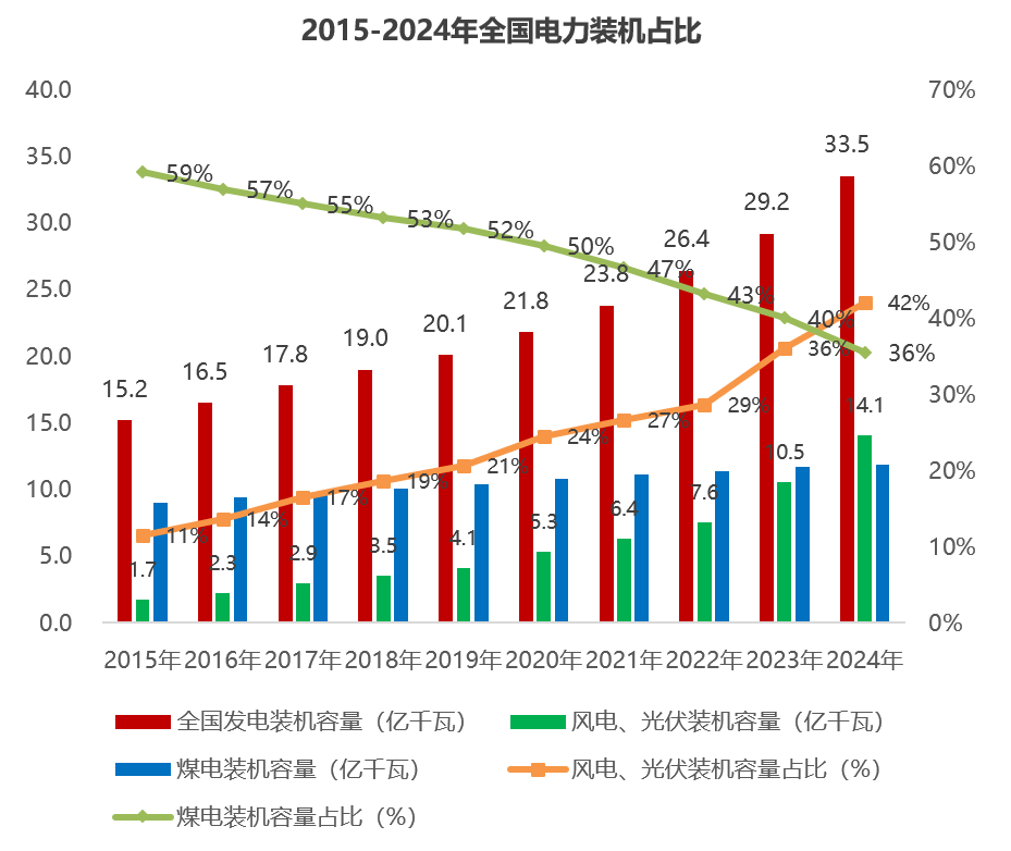 2024年底,全國新能源發(fā)電裝機規(guī)模約14.1億千瓦,占電力總裝機規(guī)模40%以上,已超煤電裝機,預(yù)計2030年占比將超50%。