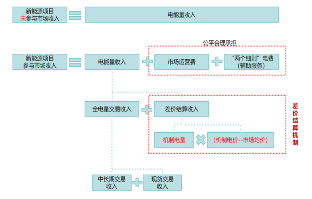 為穩(wěn)定收益預(yù)期,降低市場波動,各地政府將在市場外建立差價結(jié)算機制,新能源電能量收入將分為市場交易收入(全電量)和價差結(jié)算收入(納入機制電量)。